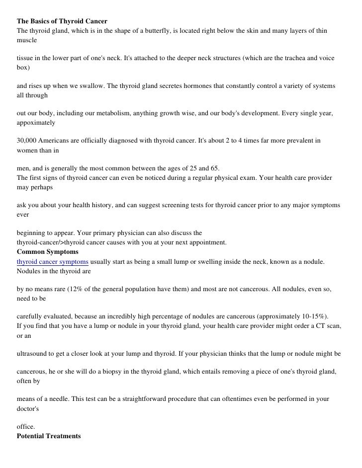 When you do not have the energy to function normally, you are unable to burn the calories needed to maintain a healthy weight. Thyroid cancer typically doesn't cause any signs or symptoms early in the disease. Some of the first symptoms you might notice are: A lump or swelling in the neck (generally seen on one side of the neck) hoarseness or changes in the voice that progress or do not go away Doctors may recommend watchful observation of small nodules. Fortunately, thyroid cancers that are detected early are highly curable. The actual diagnosis of thyroid cancer is made with a biopsy, in which cells from the suspicious area are removed and looked at in the lab. Your thyroid has two lobes, left and right, that are connected by a thin piece of tissue. There were 975 (5.2%) patients with thyroid malignant neoplasms. The first sign of it is usually the appearance of a painless lump in the front of a person's neck. Cancer lumps usually don't hurt. A lump (nodule) that can be felt through the skin on your neck changes to your voice, including increasing hoarseness Thyroid cancer arises from the cells of the thyroid gland.